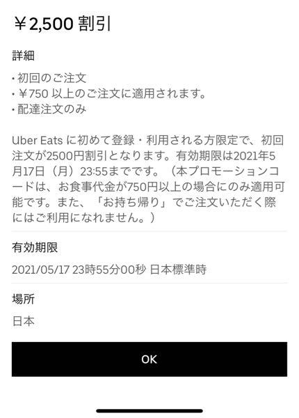 ウーバーイーツのこのクーポンって750円以上2500円以下の注文であれば