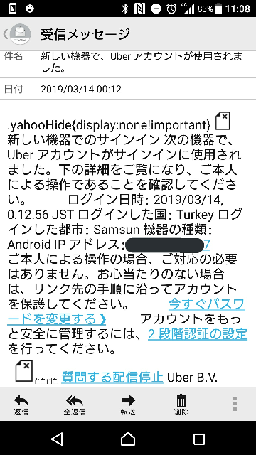 新しい機器でのサインインがありましたとUberからメールが来ました